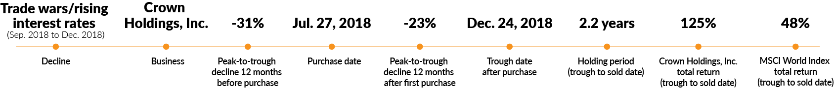 Source: FactSet Research Systems Inc. Total returns in C$. EdgePoint Global Portfolio, EdgePoint Global Growth & Income Portfolio, EdgePoint Canadian Portfolio, EdgePoint Canadian Growth & Income Portfolio and Cymbria all held Crown Holdings, Inc. The MSCI World Index is a broad-based, market-capitalization-weighted index comprising equity securities available in developed markets globally. Because the index is a widely used benchmark of the global equity market, we showed its return to provide context for Crown’s performance over the period.