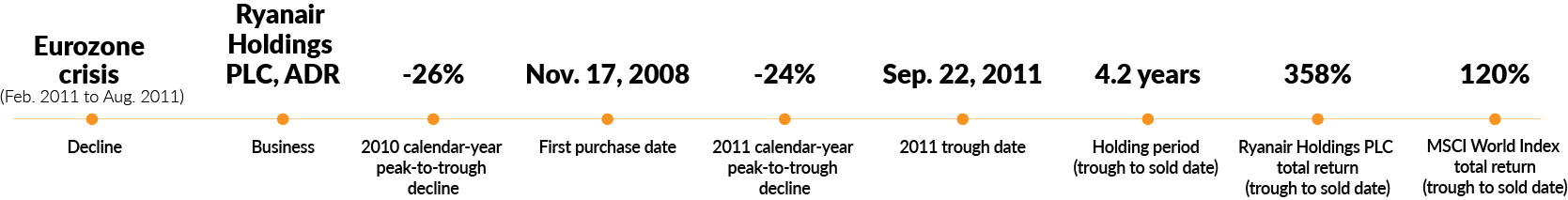 By 2011, the European sovereign debt crisis accelerated into a full-fledged eurozone crisis. At this time Ryanair Holdings PLC, the leading European low-cost airline, was already a core EdgePoint position. Over the course of the year, Ryanair's share price experienced a peak-to-trough decline of roughly 25%, creating an opportunity for EdgePoint to make Ryanair an even more sizeable position.vi