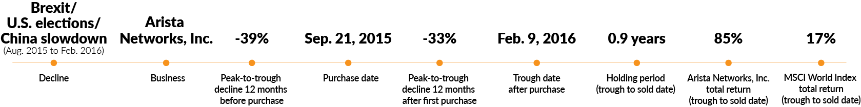 Buying businesses during this challenging backdrop was "non-obvious" and EdgePoint was able to find a variety of different ideas that had considerable growth potential, without having to pay for that growth. One business worth mentioning during this drawdown was Arista Networks, Inc., a leading supplier of cloud networking solutions. The market saw IT spending across enterprises slowing with the economy, taking Arista's share price lower given this view. Its share price declined over 30% between 2015 and 2016.viii