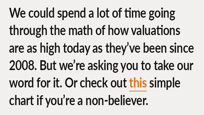 Why are we confident that future returns will be lower than the past? Mainly because overall valuations in the world are higher than they’ve ever been since we started the firm in 2008. And the bottom line is entry price dictates return. The lower the entry price, the higher the expected return and vice versa.