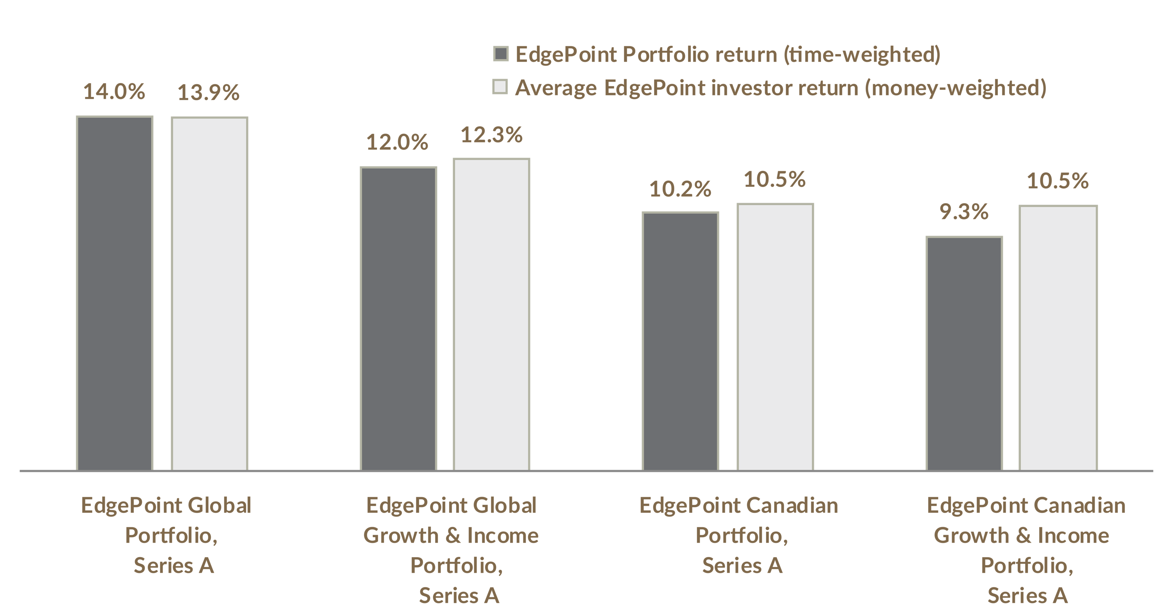 Source: EdgePoint Portfolio returns: Fundata Canada, net of fees. All returns annualized and in C$. Source, average EdgePoint investor returns: CIBC Mellon. Average EdgePoint investor returns are the average money-weighted returns net of fees across investors who held EdgePoint Portfolios, Series A from December 31, 2008 to December 31, 2018. EdgePoint Portfolio returns are time-weighted to best reflect the manager’s performance based on compound growth rate, which isn’t impacted by portfolio cash flows. Money-weighted average investor return takes into account the investor’s decision(s) regarding the timing and magnitude of cash flows and represents their personal rate of return.