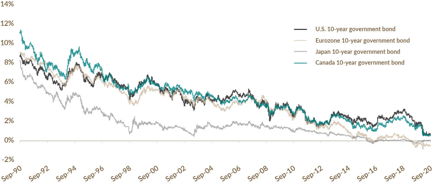 After all, we’re in the midst of an unprecedented time in most fixed-income markets and the meagre yields available today are materially different from what investors have seen before. Although investors need income, it’s become tougher to find. For decades, investors have loved balanced portfolios with the classic “60/40” split (i.e., 60% equity/40% bonds), as these balanced portfolios typically produced pleasing returns with less volatility than an all-equity portfolio. Everyone understands why the 60% equity allocation performed well over time, but most take for granted the fact that their fixed-income allocation has also done very well. The average annual return for holding 10-year U.S. government bonds from 1970 to 2019 has been 7.0%i. That’s a great return for the “less risky” part of a balanced portfolio.