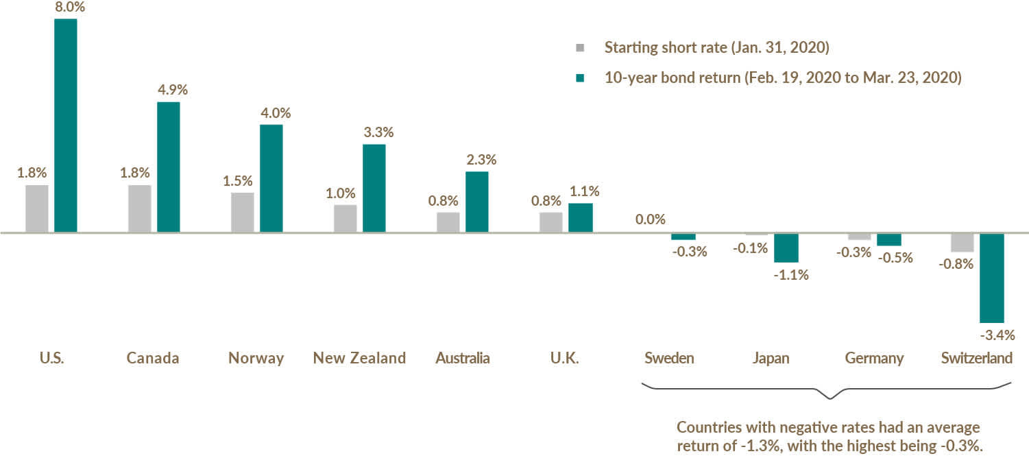 Source: Inker, Ben, “2Q 2020 GMO Quarterly Letter”, https://www.gmo.com/americas/research-library/2q-2020-gmo-quarterly-letter/. G10, or Group of 10, countries are those that agreed to the General Arrangements to Borrow, an agreement that provides funds to the International Monetary Fund. Short rates as at January 31, 2020. 10-year bond returns from February 19, 2020 to March 23, 2020.