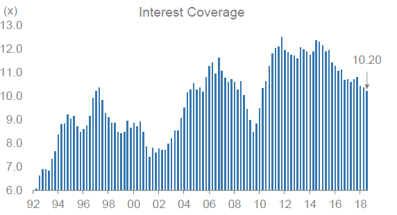 But just like I could easily make interest payments on $100 billion of debt with a 0.0% interest rate while sitting at my desk, these same corporate issuers with high amounts of debt relative to current profits still have historically low interest payments to make. Accordingly, as shown in the chart on the right-hand side above, interest coverage ratios remain relatively high by historical standards. Despite the high level of debt, interest payments are easily covered by corporate profits.