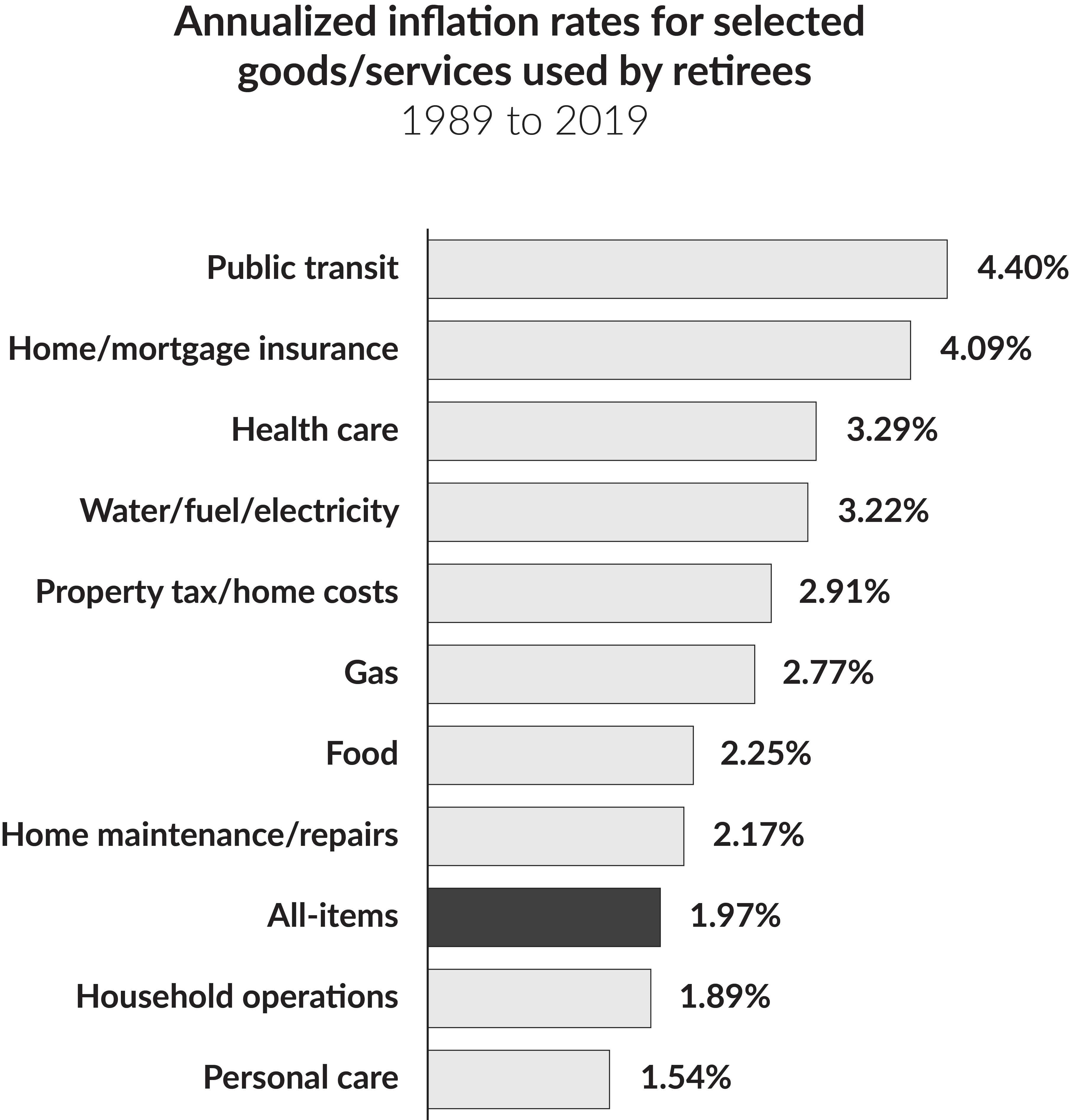The chart to the right shows the annualized inflation rates for some of the goods and services used by retirees over the last 30 years.
