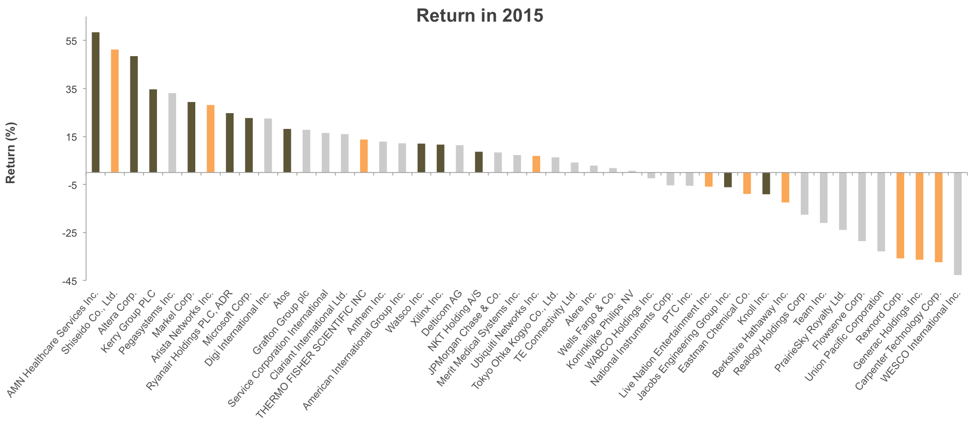 The key point that jumps out of the chart above is the vast disparity in returns of the individual names within the portfolio. In 2015, the market fell in love with companies like AMN Healthcare because the nursing shortage became obvious to everyone. And the drop in the oil price caused Ryanair’s profitability to balloon, and the market couldn’t get enough of its story. We sold our positions in both companies entirely while taking the weight down in other names on the left-hand side of the chart. We redeployed the proceeds into new and existing ideas on the right-hand side of the chart.