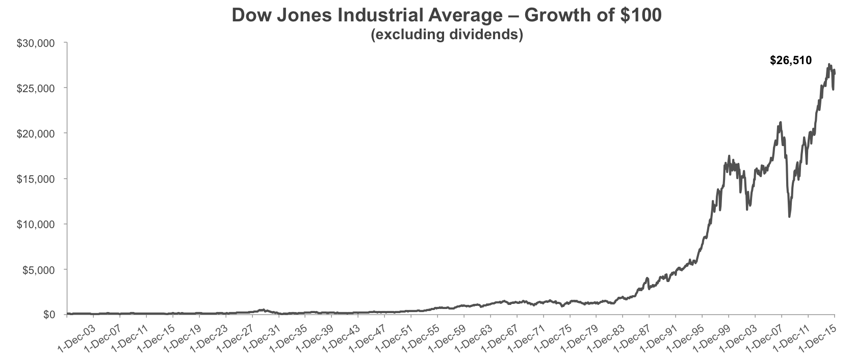 When you combine all of this data, $100 invested in the Dow Jones Industrial Average index at the beginning of 1900 would have grown to $26,510 today, not including dividends.