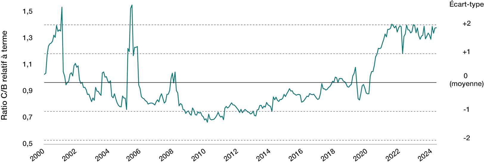 Source : Bloomberg LP. Au 31 mars 2025. Tous les chiffres sont exprimés en $US. Le ratio C/B relatif à terme est calculé en divisant le ratio C/B à terme de l'indice S&P 100 par celui de l'indice S&P MidCap 400. Il est impossible d’investir dans les indices.