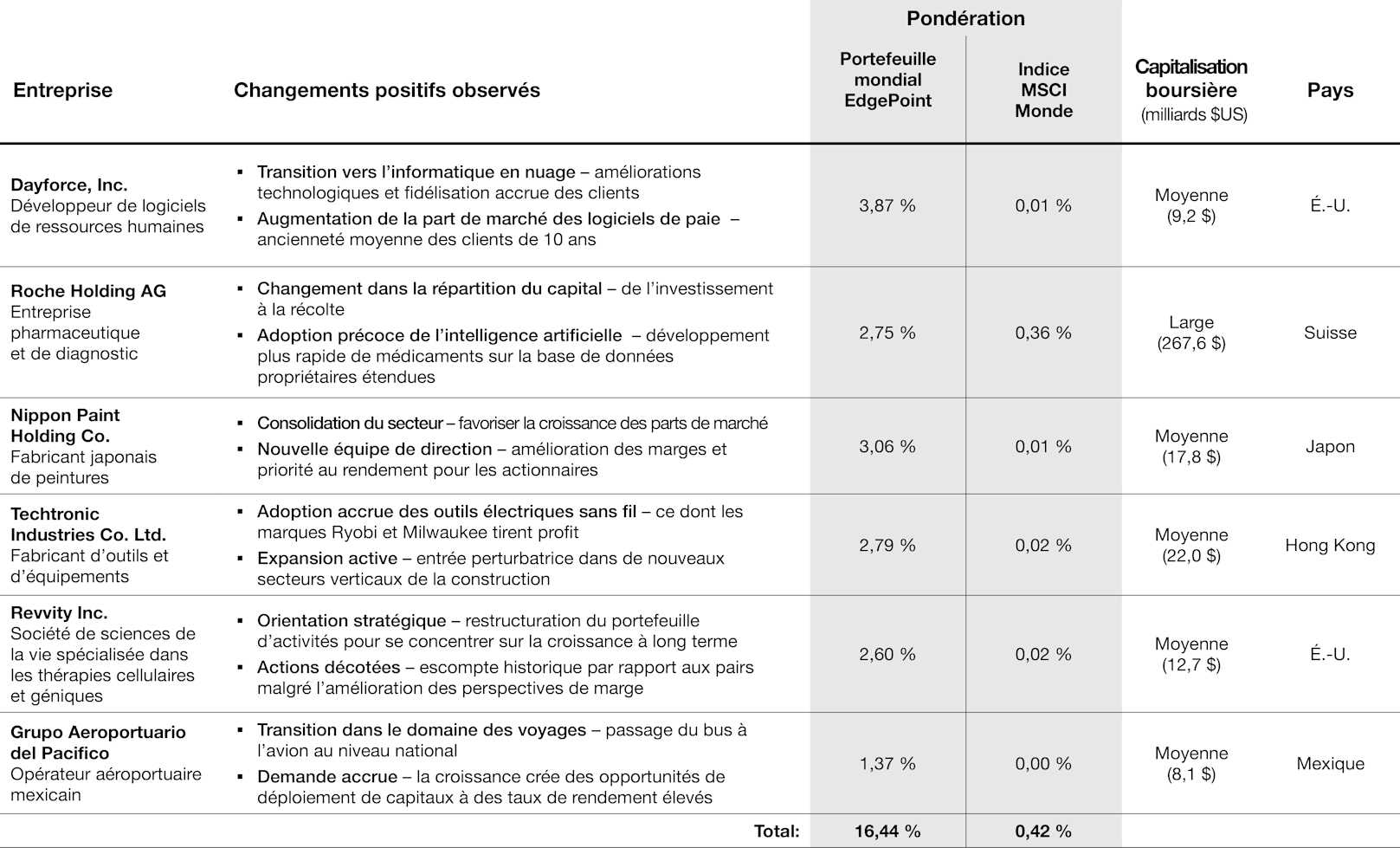 Exemples de changements positifs dans les actifs du Portefeuille mondial EdgePoint
