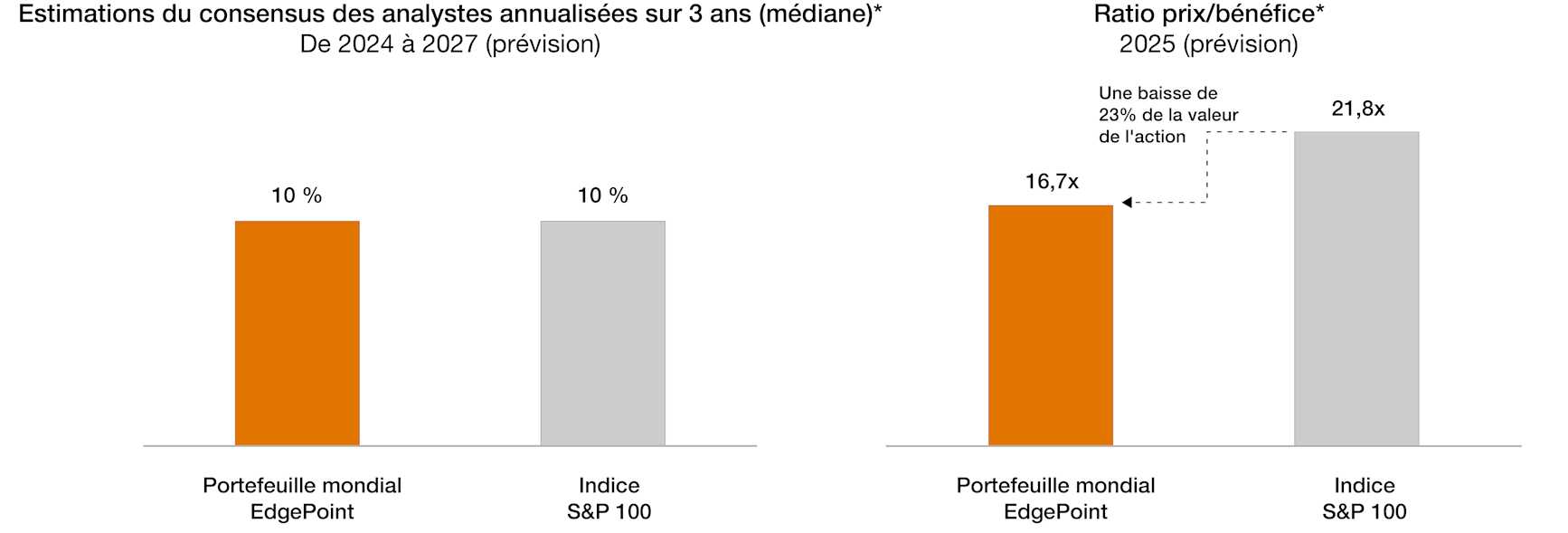 Une moyenne harmonique pondérée a été utilisée pour calculer les ratios cours/bénéfice. Les entreprises n'ayant pas d'estimations de bénéfices consensuelles pour 2027 ont été exclues de tous les calculs. 11 % des titres du Portefeuille mondial EdgePoint et 1 % des noms de l'indice S&P 100 ont été exclus en raison d'estimations consensuelles négatives pour 2024 ou de l'absence d'estimations consensuelles des bénéfices pour 2027. Bien que l'indice S&P 100 ne soit pas l'indice de référence officiel du Portefeuille mondial EdgePoint, il a été utilisé à des fins de comparaison parce qu'il comprend les 100 plus grandes entreprises américaines, qui sont également parmi les entreprises les plus discutées à l'échelle mondiale. Ces entreprises représentent également une part importante de l'indice MSCI Monde, l'indice de référence officiel du Portefeuille mondial EdgePoint. L'indice MSCI Monde est un indice pondéré en fonction de la capitalisation boursière qui comprend des titres de participation disponibles sur les marchés développés à l'échelle mondiale. Nous gérons nos portefeuilles indépendamment des indices que nous utilisons pour comparer les rendements à long terme. Des différences telles que les titres détenus et les répartitions géographiques/sectorielles peuvent avoir une incidence sur la comparabilité avec l'indice.