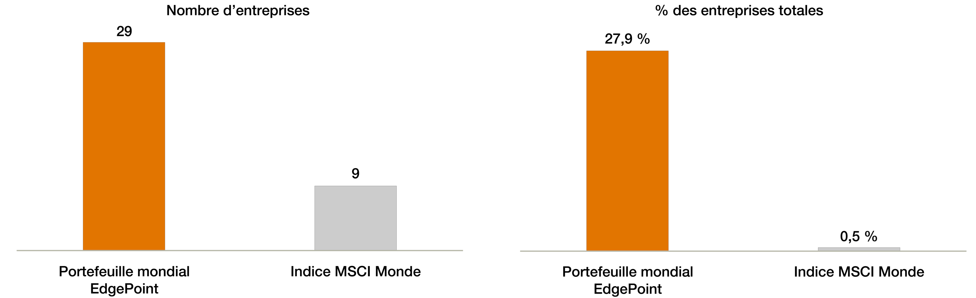 Le Portefeuille mondial EdgePoint a toujours détenu entre 40 et 50 entreprises à tout moment. Au cours des cinq dernières années, l’indice MSCI Monde a regroupé plus de 1 900 entreprises, mais seulement neuf d’entre elles ont contribué à plus de 1 % du rendement global. En revanche, le Portefeuille mondial EdgePoint détenait 29 placements qui ont chacun ajouté plus de 1 % à notre portefeuille. Comme le montre le graphique de droite, 28 % de nos idées ont généré un rendement supérieur à ce seuil pour le portefeuille, contre seulement 0,5 % pour l’indice MSCI Monde.