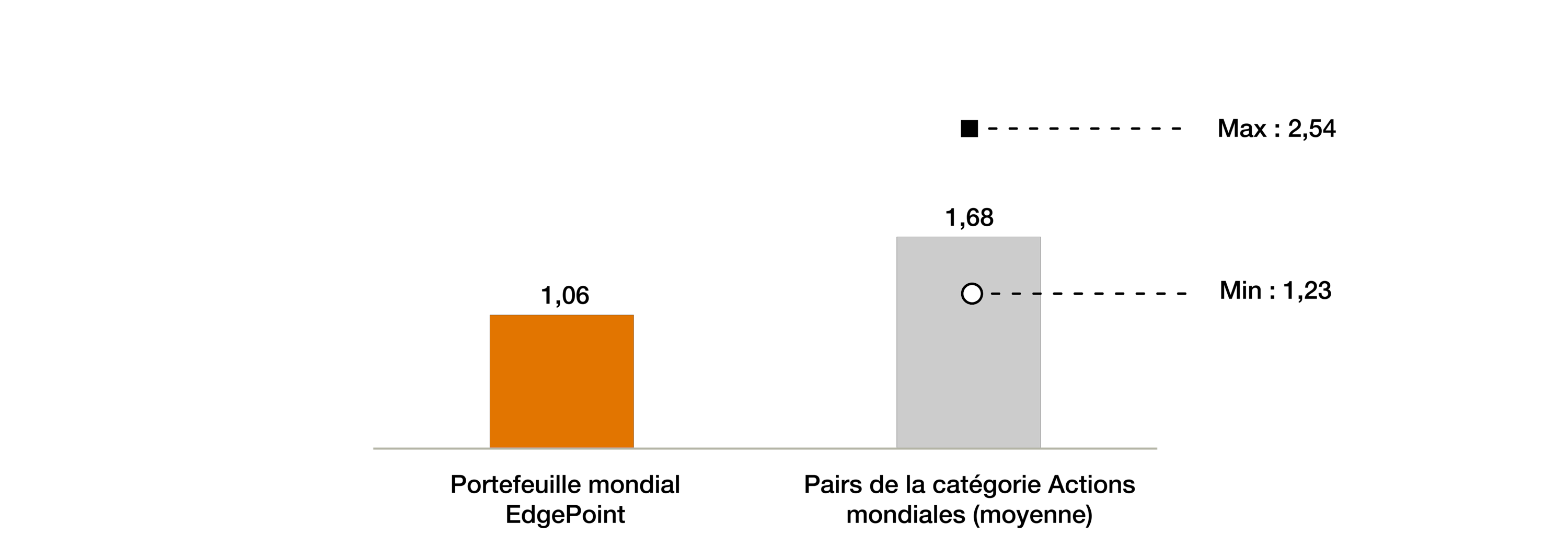 Outre ces rendements relatifs, les investisseurs paient des frais pour cette gestion « active ». Le coût actif est le rapport entre les frais d’un fonds et sa part active. Plus ce chiffre est bas, moins vous payez pour la gestion active. Par rapport au Portefeuille mondial EdgePoint, le coût actif de nos concurrents est 60 % plus élevé. Cela signifie que leurs gestionnaires facturent des frais supérieurs, tout en offrant une gestion moins active. Personne n’apprécie « payer plus pour obtenir moins ».