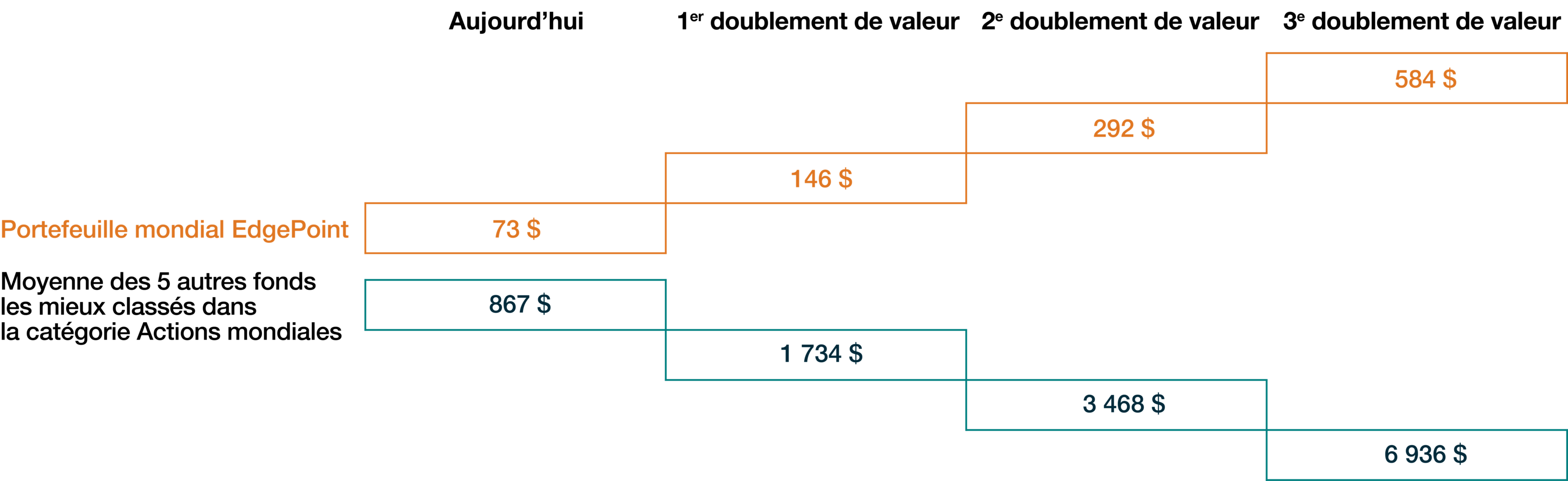 Dans l’exemple précédent, pour que la participation moyenne double trois fois, il faudrait ajouter 6,1 milles milliards $US à la capitalisation boursière. C’est un défi de taille si l’on considère qu’une entreprise devrait augmenter sa valeur de plus de 150 % par rapport à la plus grande entreprise mondiale, NVIDIA, dont la capitalisation boursière dépasse les 4 milles milliards $US. En revanche, la participation moyenne du Portefeuille mondial d’EdgePoint peut doubler plusieurs fois tout en restant nettement inférieure à la participation actuelle de nos concurrents.