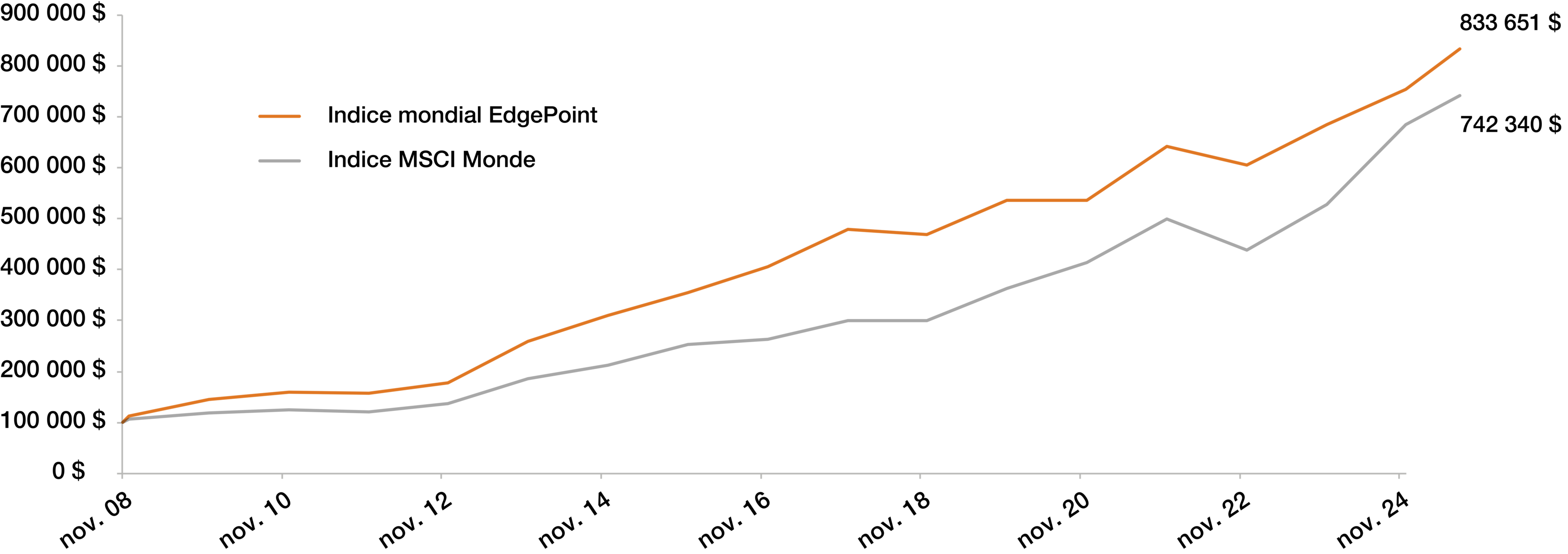 Indice MSCI Monde – Depuis la création du Portefeuille EdgePoint (17 novembre 2008) : 12,92 % 15 ans : 13,31 %; 10 ans : 12,84 %; 5 ans : 15,35 %; 3 ans : 24,23 %; 1 an : 20,76 %, ÀCJ : 13,61 %.