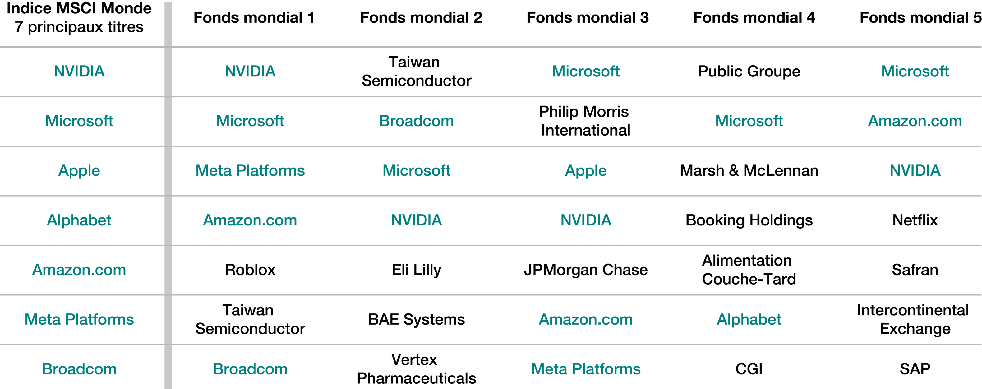 Source : FactSet Research Systems Inc. Au 31 août 2025. L’exemple ci-dessus est donné à titre indicatif uniquement et ne constitue pas un conseil en placement. Ces fonds ont été sélectionnés parce qu’ils sont les plus importants en termes d’actifs sous gestion dans la catégorie Actions mondiales de Morningstar, à l’exception du Fonds mondial EdgePoint qui ne détient aucune des sept principales positions de l’indice MSCI Monde. Morningstar classe le Portefeuille mondial EdgePoint dans le groupe de pairs Actions mondiales, qui regroupe les fonds communs de placement à capital variable qui investissent dans des titres domiciliés partout dans le monde et dont la capitalisation boursière moyenne est supérieure à celle des petites et moyennes capitalisations. Ces fonds doivent investir entre 10 % et 90 % de leurs actions dans des entreprises canadiennes ou américaines. Les fonds qui ne sont pas soumis à des restrictions d’investissement strictes et qui ne sont pas admissibles à d’autres catégories géographiques sont classés dans cette catégorie. L’indice MSCI Monde est un indice large, pondéré en fonction de la capitalisation boursière, qui comprend des titres de participation disponibles sur les marchés développés du monde entier. Cet indice a été choisi car il s’agit d’un indice de référence largement utilisé sur le marché mondial des actions. Il est impossible d’investir dans l’indice. Référez-vous à la section Informations importantes – fonds de la catégorie Actions mondiales et Informations importantes – Indice MSCI Monde pour plus de détails.
