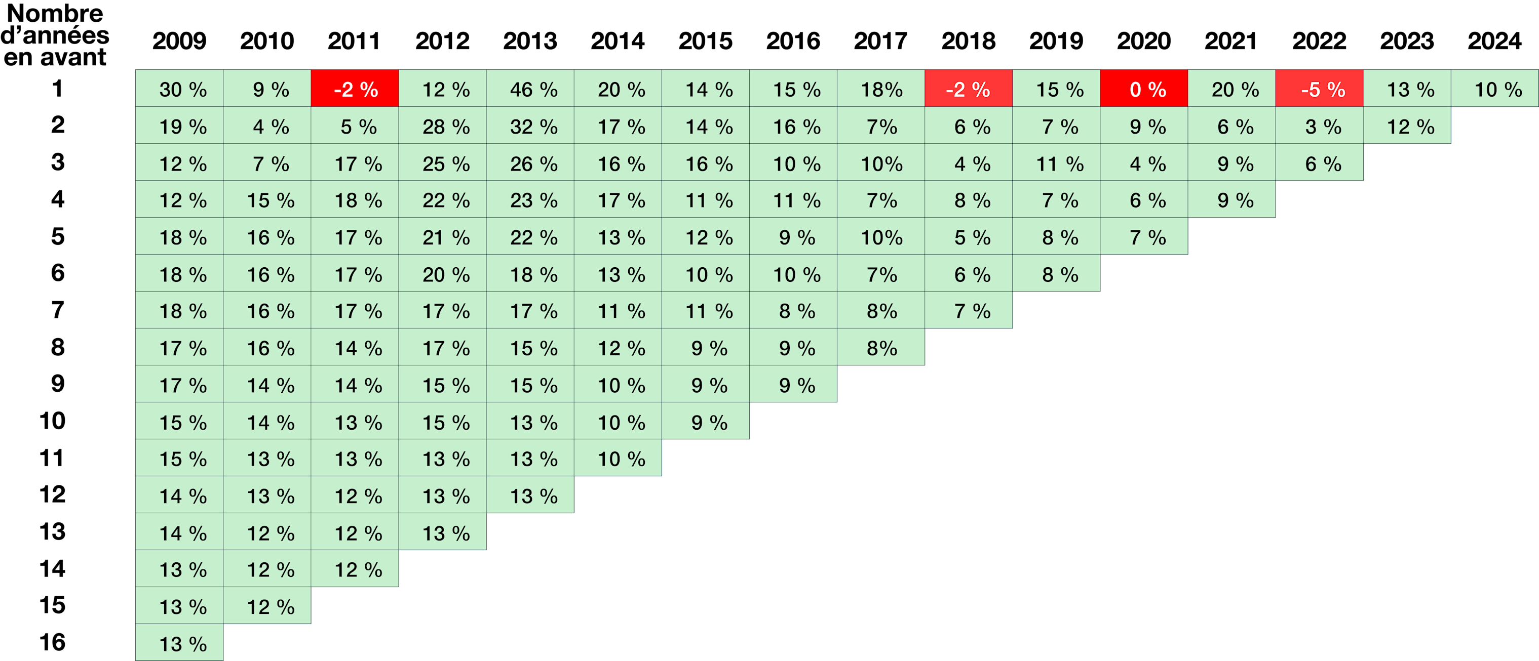 Le parcours a été marqué jusqu’à présent par une volatilité à court terme, mais les investisseurs qui ont investi dans le Portefeuille mondial EdgePoint au fil du temps ont rarement subi de pertes à long terme. Le tableau suivant présente les rendements annualisés en fonction de la date de votre premier investissement (axe horizontal) et de la durée de votre investissement (axe vertical). Par exemple, un investissement réalisé le 1er janvier 2009 aurait généré un rendement de 30 % sur un an (première colonne vers le bas), un rendement annualisé de 19 % sur deux ans et un rendement annualisé de 13 % sur 16 ans. Les rendements sont codés par couleur : vert pour les