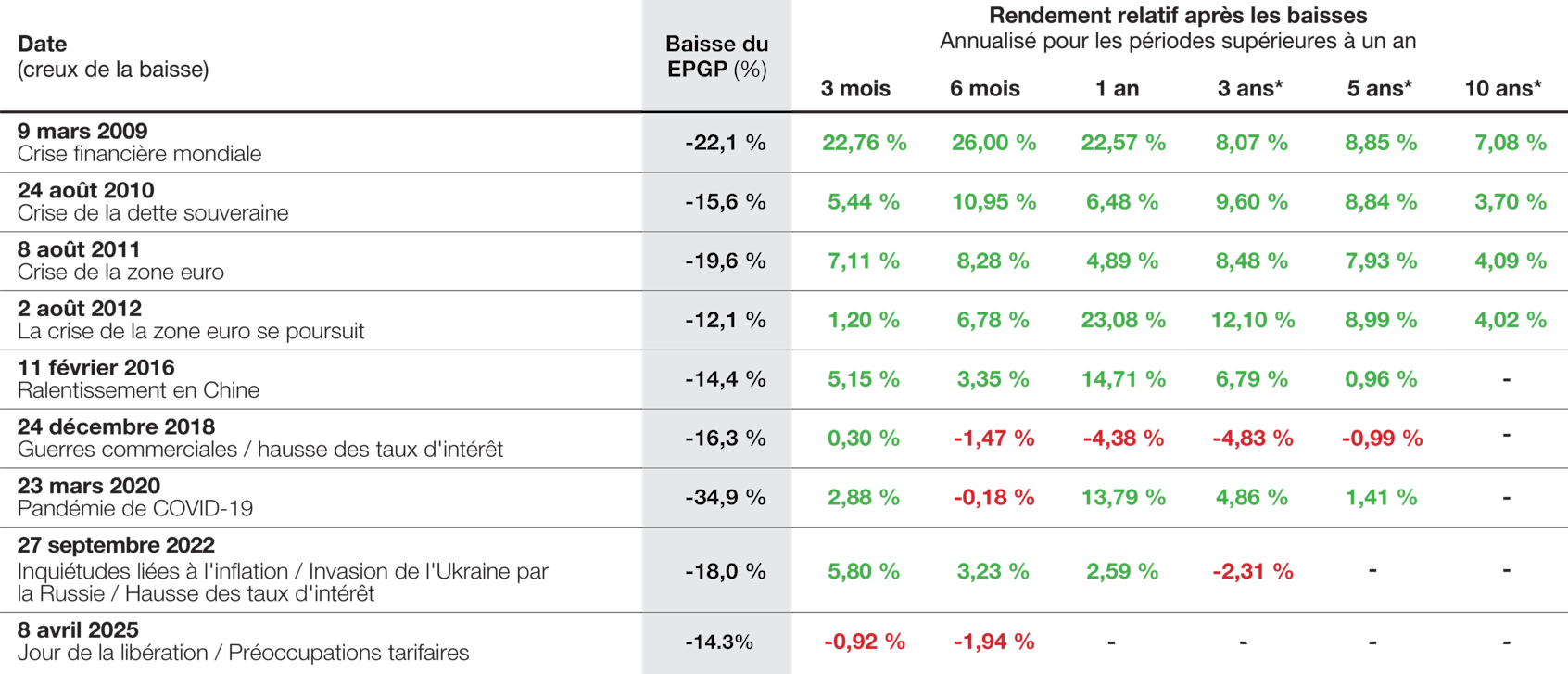 Depuis notre lancement en 2008, notre histoire nous montre que nous avons apporté une grande valeur ajoutée pendant les périodes de volatilité comme celle-ci, et nos clients finaux ont toujours obtenu de bons résultats avec nous dans les années qui ont suivi. Nos partenaires à long terme sont tellement alignés avec nous qu’ils ont pris une décision en avril qui a pu surprendre les observateurs extérieurs : au plus fort de la folie et de l’incertitude des marchés, nos investisseurs ont décidé de nous donner plus d’argent. Les 9 et 10 avril, les deux pires journées du marché, nous avons enregistré les plus importants afflux de capitaux de l’histoire d’EdgePoint.