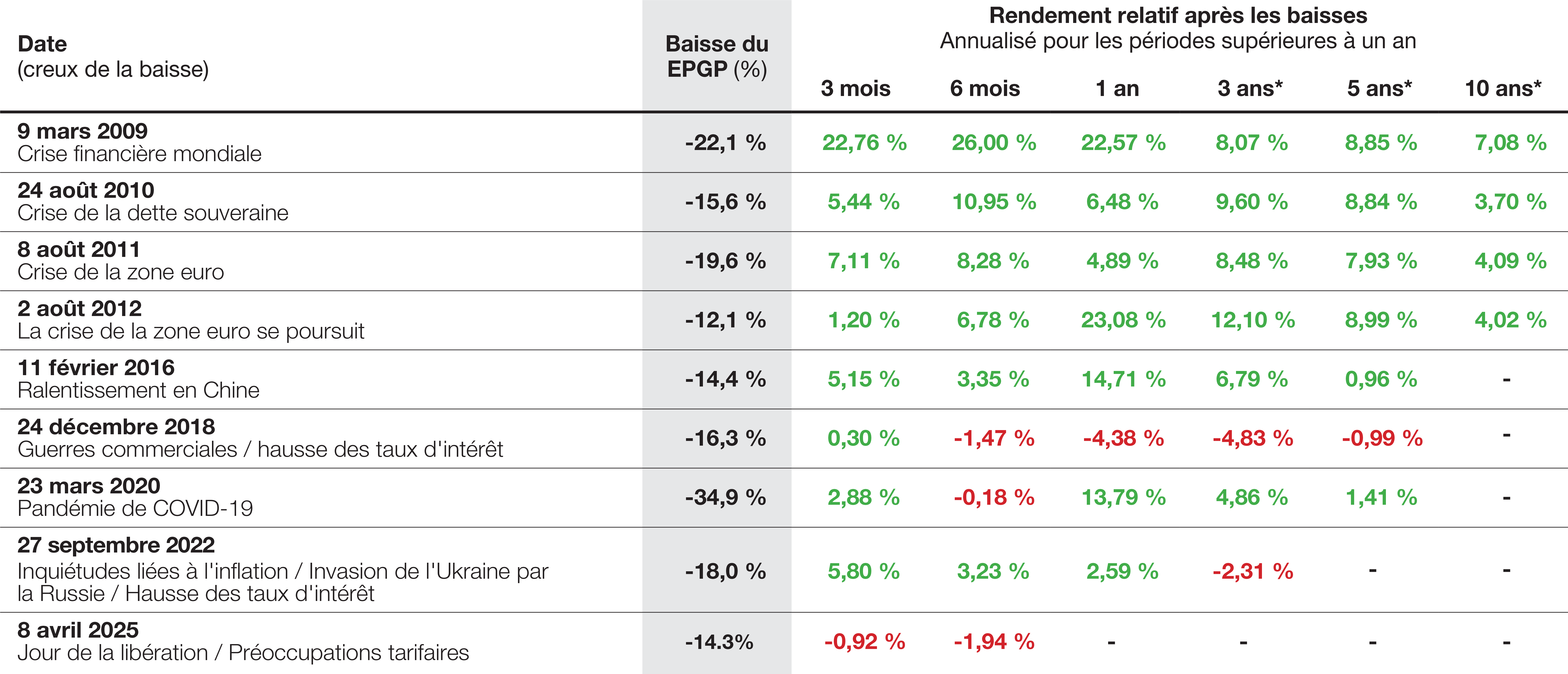 Depuis notre lancement en 2008, notre histoire nous montre que nous avons apporté une grande valeur ajoutée pendant les périodes de volatilité comme celle-ci, et nos clients finaux ont toujours obtenu de bons résultats avec nous dans les années qui ont suivi. Nos partenaires à long terme sont tellement alignés avec nous qu’ils ont pris une décision en avril qui a pu surprendre les observateurs extérieurs : au plus fort de la folie et de l’incertitude des marchés, nos investisseurs ont décidé de nous donner plus d’argent. Les 9 et 10 avril, les deux pires journées du marché, nous avons enregistré les plus importants afflux de capitaux de l’histoire d’EdgePoint.