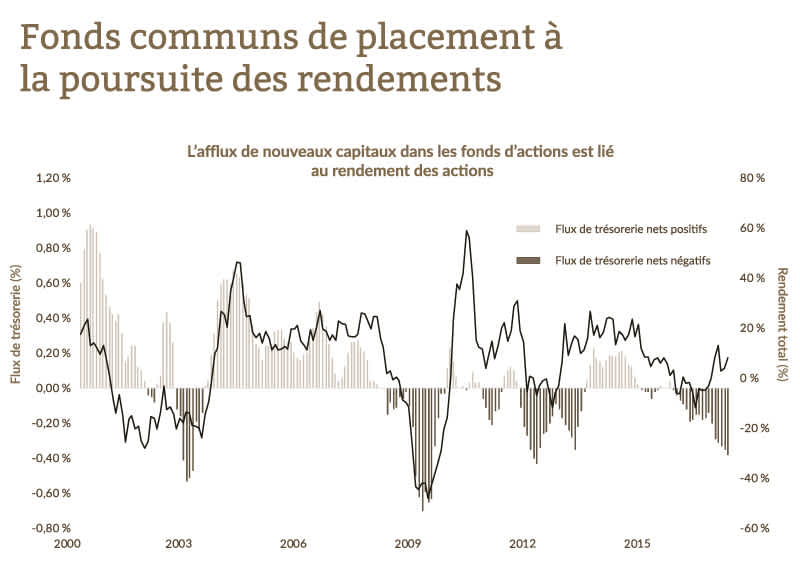 Nous sommes conscients que ce concept, simple à première vue, est difficile à mettre en pratique. Le graphique suivant illustre les entrées et les sorties des fonds communs de placement dans le temps et de quelle manière le montant investi augmente avec les rendements. À l’inverse, lorsque les rendements sont à la baisse, les flux se tarissent. En d’autres termes, les investisseurs cherchent à obtenir des rendements à leur propre détriment, en vendant et en achetant des placements aux pires moments.
