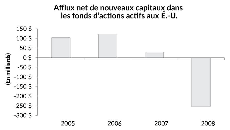 Dans les années qui ont précédé la crise financière, les investisseurs ont accumulé leur argent dans les actions. De 2005 à 2007, les investisseurs américains ont placé 256 G$ dans les fonds d’actions. En 2008, ils en ont retiré la quasi-totalité (254 G$) dans une même année, encaissant leurs placements au creux du marchévi.