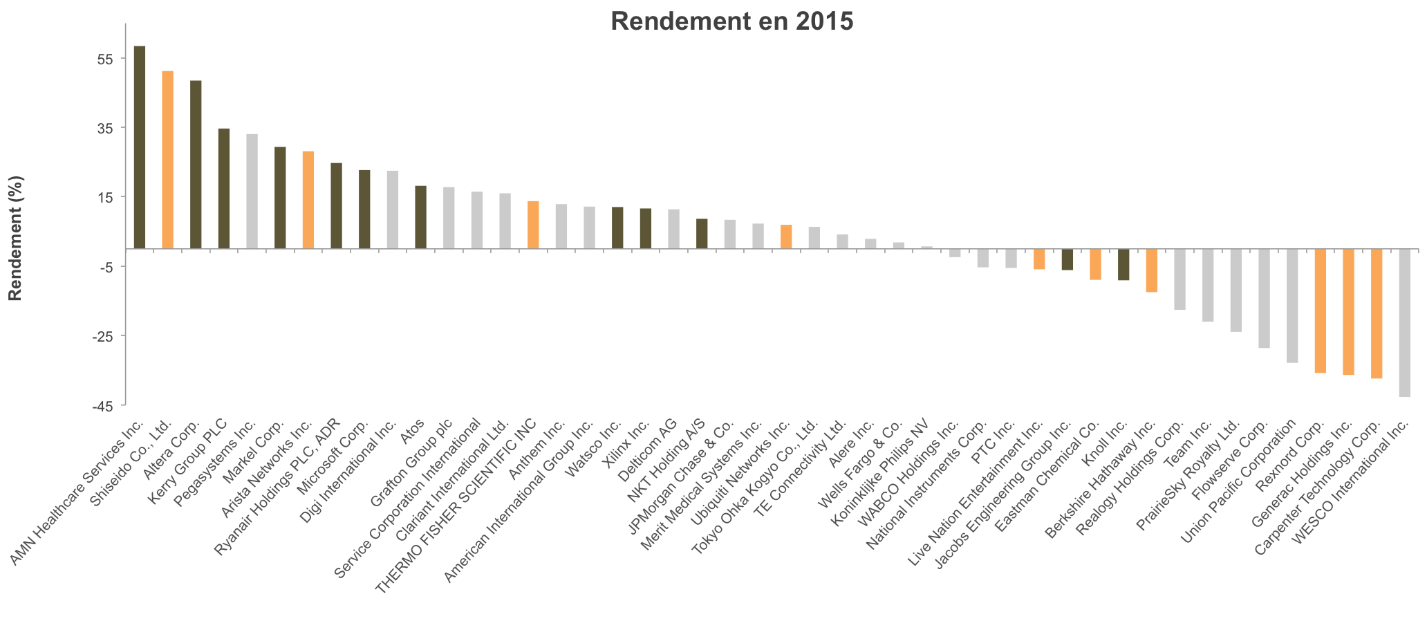 Le paragraphe suivant présente le taux de rendement annuel pour chacun des titres compris dans le Portefeuille mondial EdgePoint en 2015. Les barres vertes représentent les nouvelles acquisitions effectuées durant le dernier exercice et les barres rouges représentent les titres qui ont été vendus durant l’exercice.