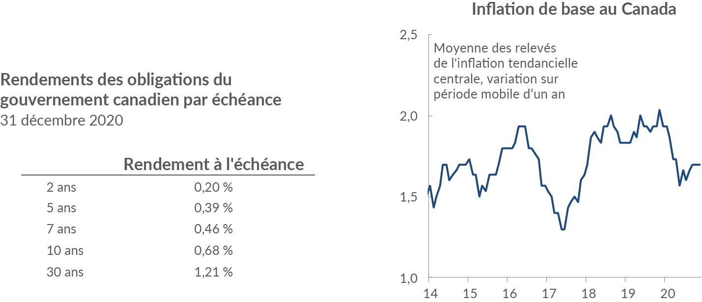 Source : Rendements des obligations du gouvernement du Canada ; Bloomberg LP. Au 31 décembre 2020 ; Inflation de base au Canada : Économie de la Banque Scotia, Statistique Canada. Au 16 décembre 2020.