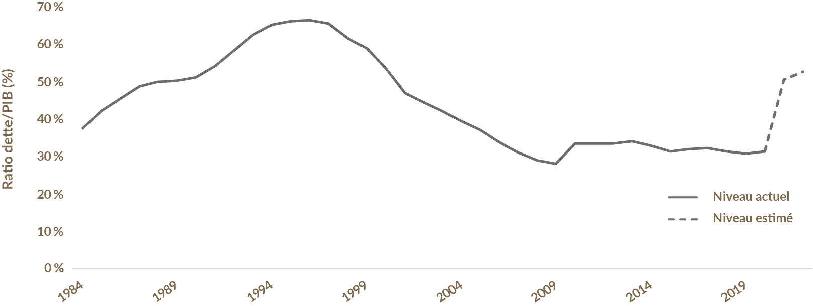 Les valeurs de 2020/2021 à 2022/2023 de la dette par rapport au PIB sont des estimations.