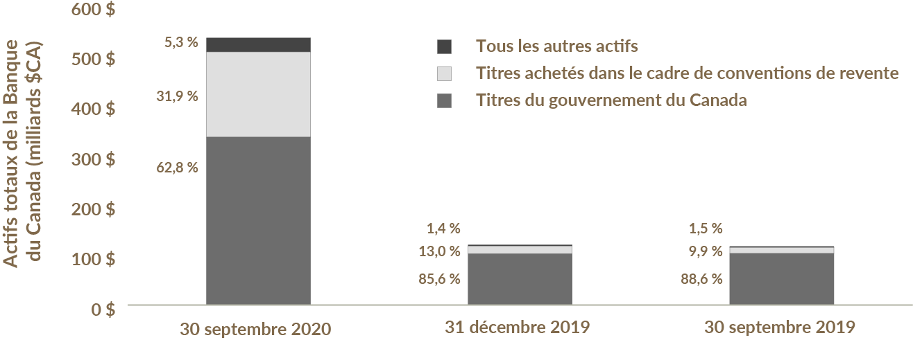 Source : Canada. Banque du Canada. 2020 Rapport financier trimestriel 2020, Canada, 2020. https://www.bankofcanada.ca/wp-content/uploads/2020/11/quarterly-financial-report-third-quarter_2020.pdf. Les contrats d'achat et de revente sont une forme de financement garanti où l'acheteur des titres prête des espèces au vendeur; c'est ainsi que la Banque du Canada prête de l'argent aux banques commerciales.