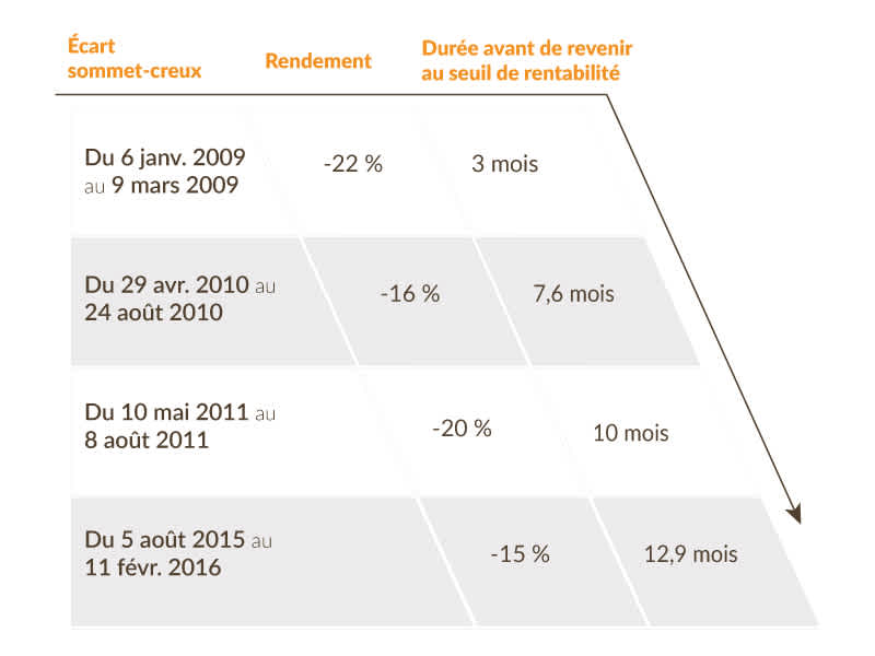 Nous voulons tout avoir. Nous sommes à la recherche de relations à long terme, car il y a longtemps que les aventures sans lendemain ne nous attirent plus. Nous le savons, ce n’est pas chose facile. Nous n’aurons pas toujours si fière allure. Vous devez comprendre cela. Nous sommes prêts à nous engager envers vous, est-ce la même chose de votre côté? Posez-vous la question suivante : si notre performance commence à se détériorer à un moment donné, nous resterez-vous fidèle ou commencerez-vous à regarder ailleurs? Il y aura des périodes difficiles, croyez-nous. Vous n’avez qu’à regarder les plus importantes baisses du Portefeuille mondial EdgePoint enregistrées au cours des années.