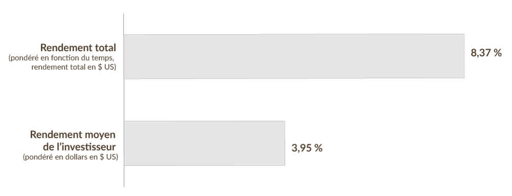 Source : Bloomberg LP. Morningstar Direct; Indice composé S&P/TSX : Morningstar Direct; Indice MSCI Monde : Morningstar Direct; Obligations : Indice Bloomberg Barclays U.S. Aggregate Bond Index; Capital; Or : Prix au comptant de l’or par once Troy selon Bloomberg; Habitations : Indice S&P/Case Schiller des prix de l’immobilier aux États-Unis; Pétrole : Bloomberg WTI Cushing Crude; Inflation : Indice des prix à la consommation aux États-Unis; Taux sans risque : selon le rendement d’un bon du Trésor américain à trois mois; Rendement de l’investisseur moyen : le rendement moyen que tire un investisseur de la répartition des catégories d’actifs selon la variation des actifs de fonds communs de placement après exclusion des souscriptions, des rachats et des échanges. Le rendement pondéré en dollars tient compte des décisions de l’investisseur concernant le moment et l’ampleur des entrées et des sorties de fonds dans le portefeuille et représente le taux de rendement personnel de l’investisseur. Tous les rendements sont annualisés et exprimés en dollars américains.