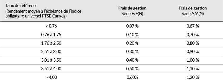 Les frais de gestion sont fixés au début de chaque trimestre civil. Les frais sont déterminés en fonction du rendement moyen quotidien à l'échéance de l'indice FTSE Canada Universe Bond (« taux de référence ») du trimestre précédent.