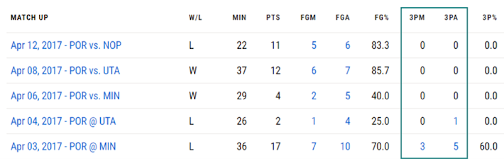 The Trailblazers wanted their players to shoot more 3-pointers accurately. Maurice made 68 out of 194 (35.1%) of his 3-point attempts for the 2017 season, but looking at the last five games of the regular season tells an interesting story: