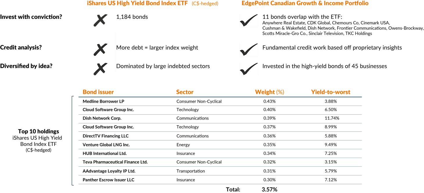 Source, bonds: BlackRock, Inc. Source, yield-to-worst: Bloomberg LP. As at June 30, 2024. Number of businesses invested in represents high-yield holdings in EdgePoint Canadian Growth & Income Portfolio only. Yield-to-worst is a measure of the lowest possible yield that an investor would receive for owning the bond. See endnote v for additional information on the iShares US High Yield Bond Index ETF. Although the ETF is not an official benchmark of the high-yield portion of the EdgePoint Canadian Growth & Income Portfolio, it is representative of high-yield corporate bonds available to fixed income investors.