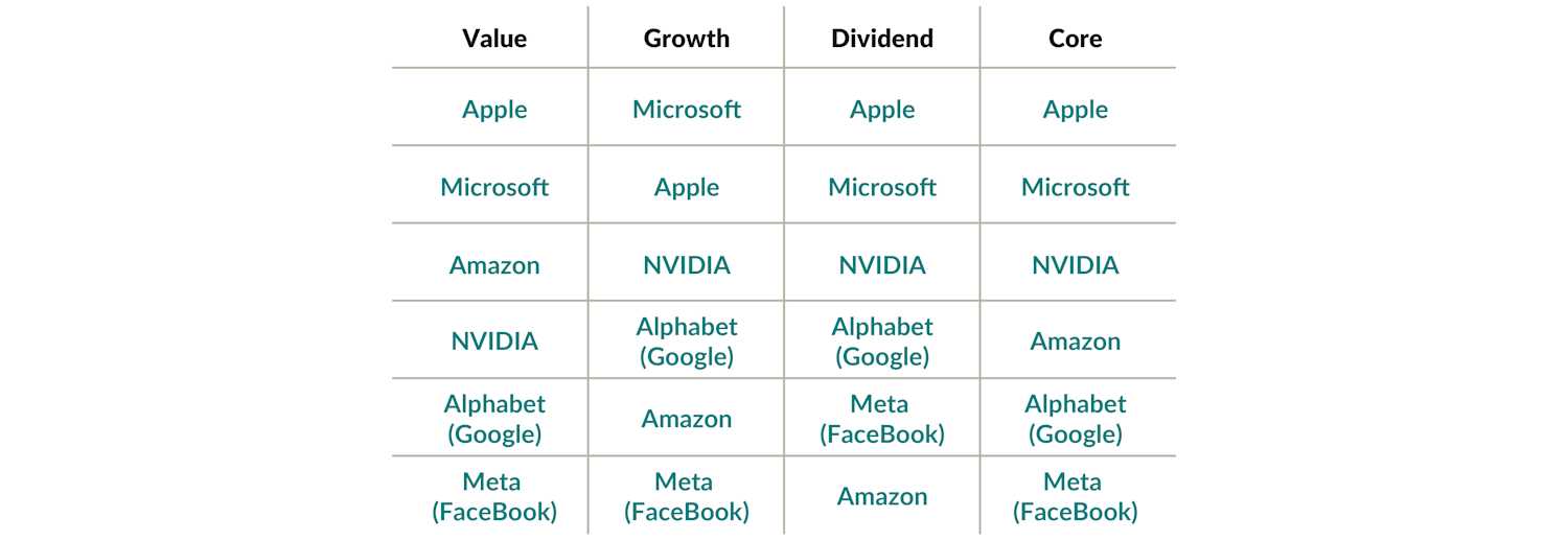 So, what does Dolly and cloning have to do with investing? Look at the recent top holdings of one fund company’s four distinct U.S. equity funds: