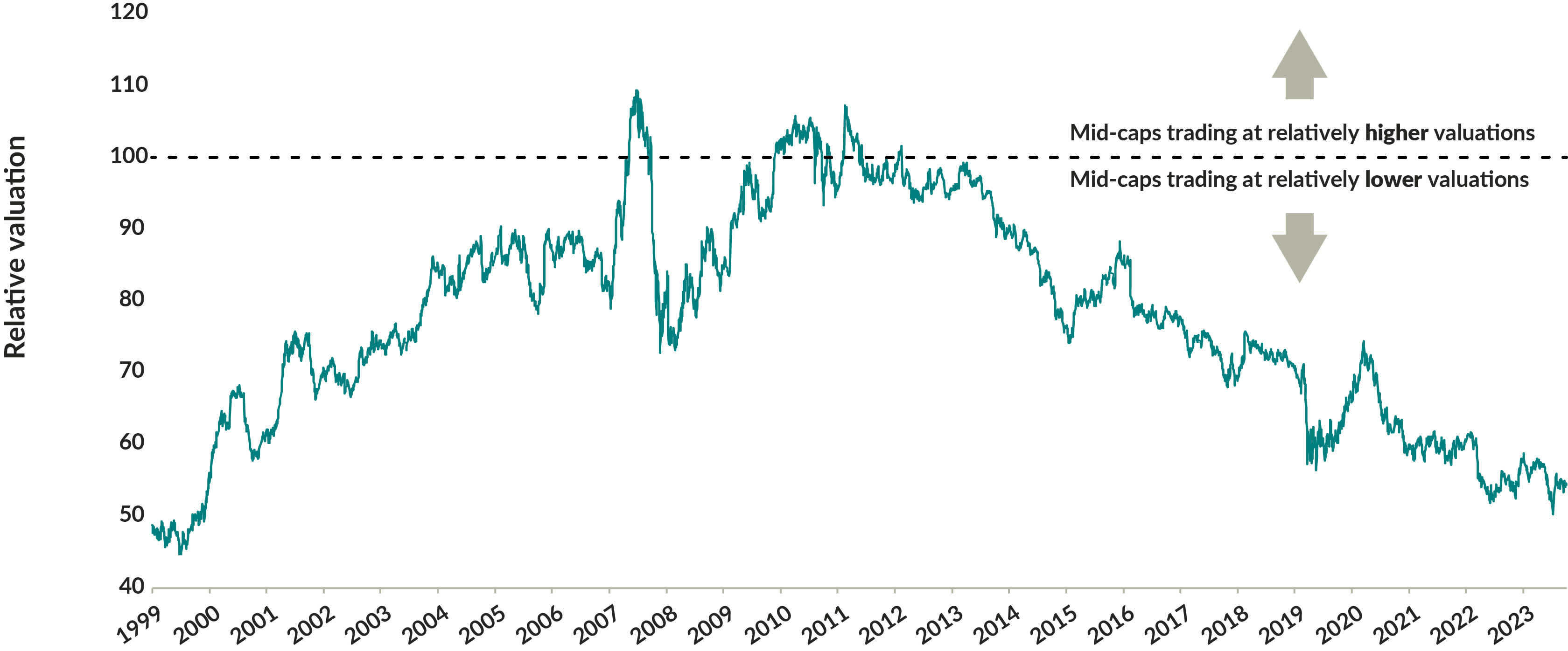S&P 100 Index vs. S&P 400 MidCap Index – Relative valuations (average)