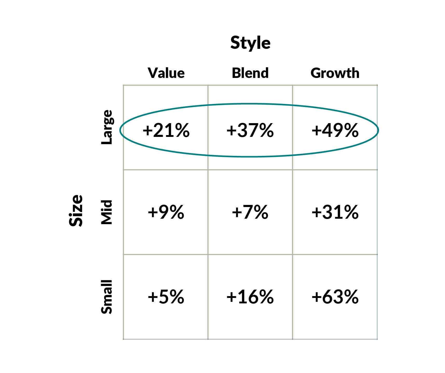The popularity of large caps, especially growth stocks, has resulted in high valuations today relative to the average over the last 20 years. Large-cap companies, irrespective of style category, are trading at premiums between 21% and 49% on average: