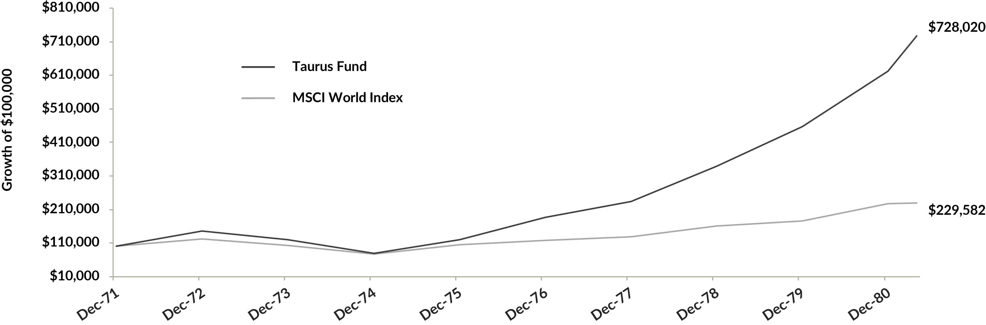 Source, MSCI and Trimark returns: Morningstar Direct. Source, Taurus: Bolton Tremblay Funds Inc. 1982 Annual Report. The above values are for illustrative purposes only and do not represent an actual client’s results. Total annual returns, net of fees, measured in C$. Historical performance is not indicative of future returns. The Taurus Fund, Trimark Fund and EdgePoint Global Portfolio are used for illustrative purposes only to demonstrate the history of the investment approach. All of the funds applied the same investment approach across different companies, investment teams and members for the periods shown. The MSCI World Index is a market-capitalization-weighted index comprising equity securities available in developed markets globally. The MSCI World Index was used for comparison purposes as it represents a broad global equity universe across several developed market countries. The index is not investible. The three Funds were managed independently of the index used for comparison purposes. Differences for all three Funds including security holdings, geographic/sector allocations and market cap size may impact comparability. See Important information – Indexes and Important information – Funds additional details.