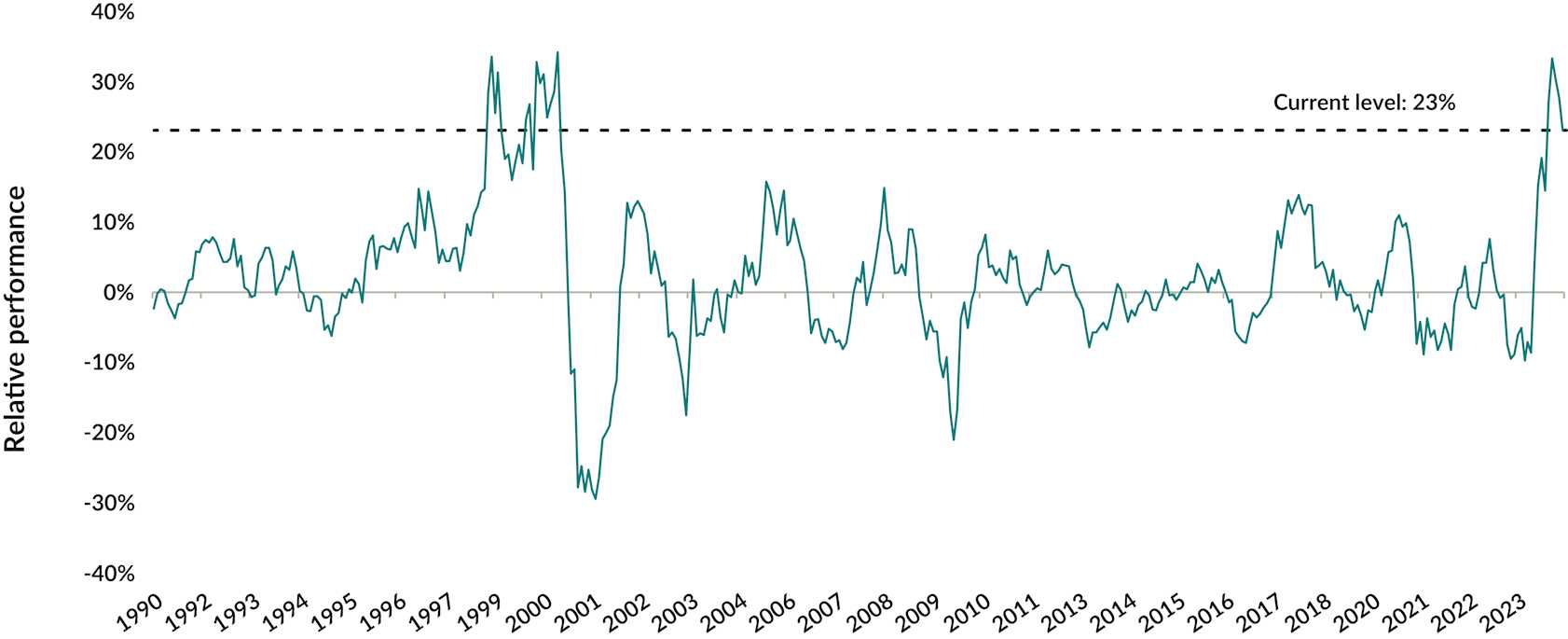 Source: FactSet Research Inc. As at September 30, 2024. Relative valuations are the daily average of five valuation metrics for the two indexes: price-to-earnings ratio, price-to-book-value ratio, price-to-cash-flow ratio, price-to-sales ratio and enterprise value-to-earnings before interest, taxes, depreciation and amortization. See Important information – Indexes for additional details.