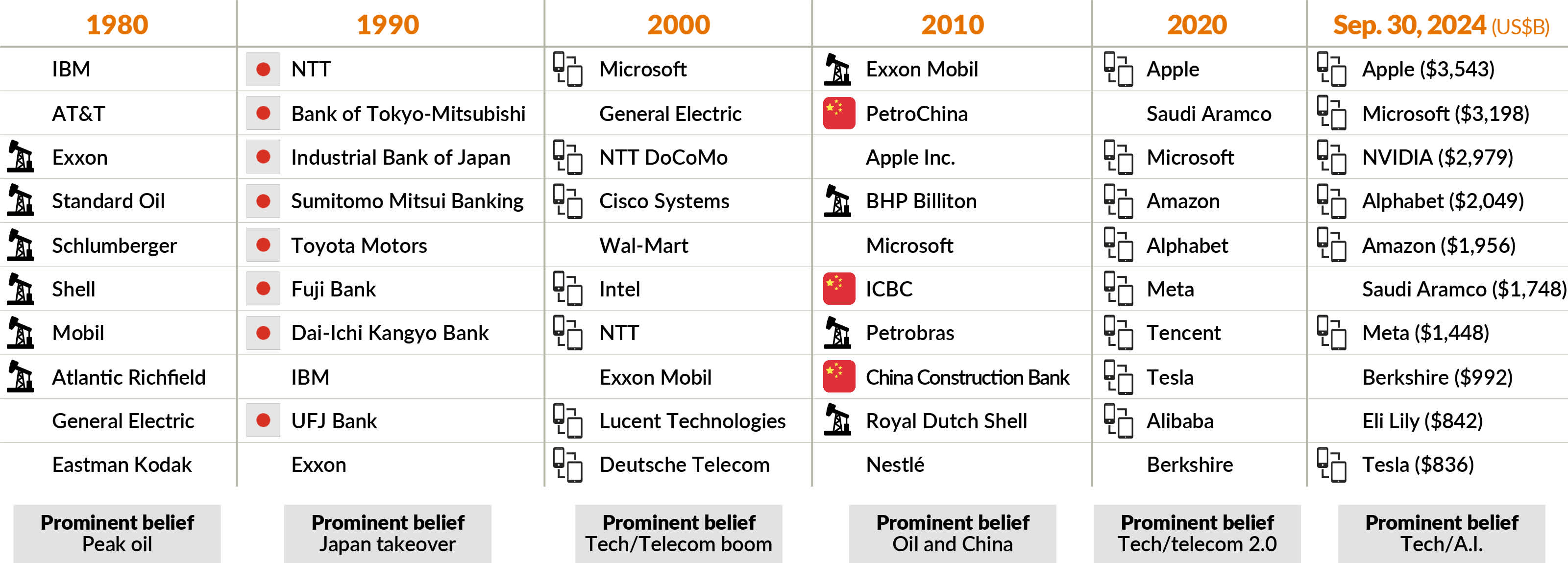 Source, decades: J. Mauldin, “Bonfire of the Absurdities”, Mauldin Economics, November 17, 2017. Source, 2020 & 2024: FactSet Research Systems Inc. Market cap in US$. The 2020 data is as at January 1, 2020.