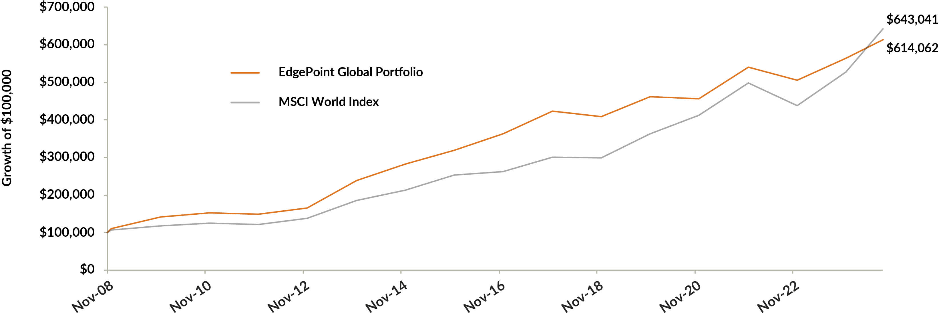 Our investment discipline, which goes back over 50 years throughout all kinds of markets, economic cycles and investment trends, has stood the test of time and has generally outperformed the index. EdgePoint employees understand the role that the willingness to stand apart from the herd played in that relative outperformance. It’s why we’re the largest investors in EdgePoint’s Portfolios and have C$398 million invested alongside our clients.vii