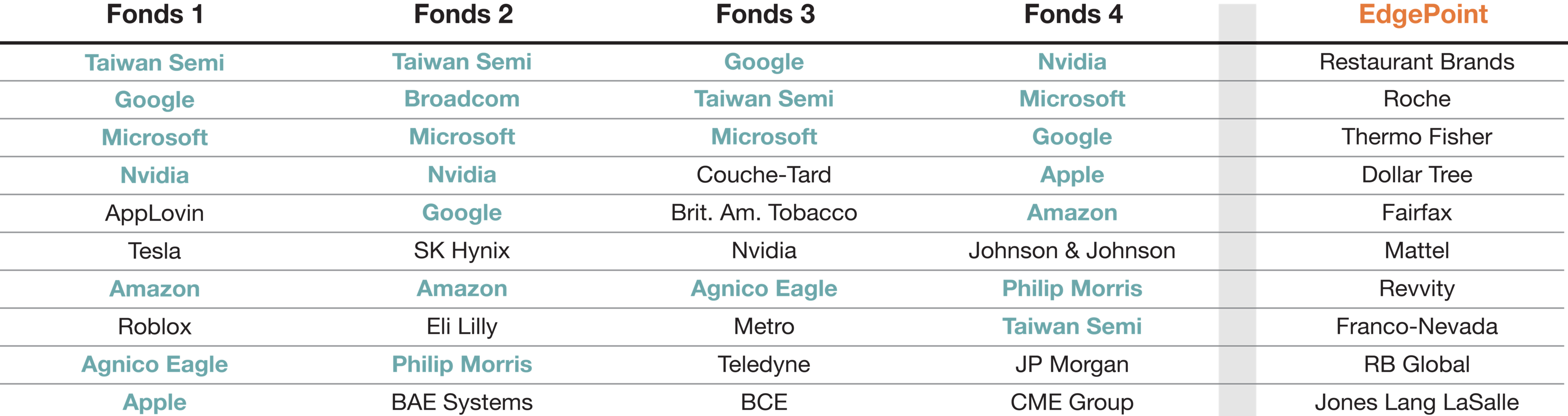 Pire encore, bon nombre de ces fonds ressemblent non seulement à leur indice de référence, mais aussi les uns aux autres. Voici les 10 principaux titres des plus grands fonds de la catégorie Actions mondiales par rapport au Portefeuille mondial EdgePoint: