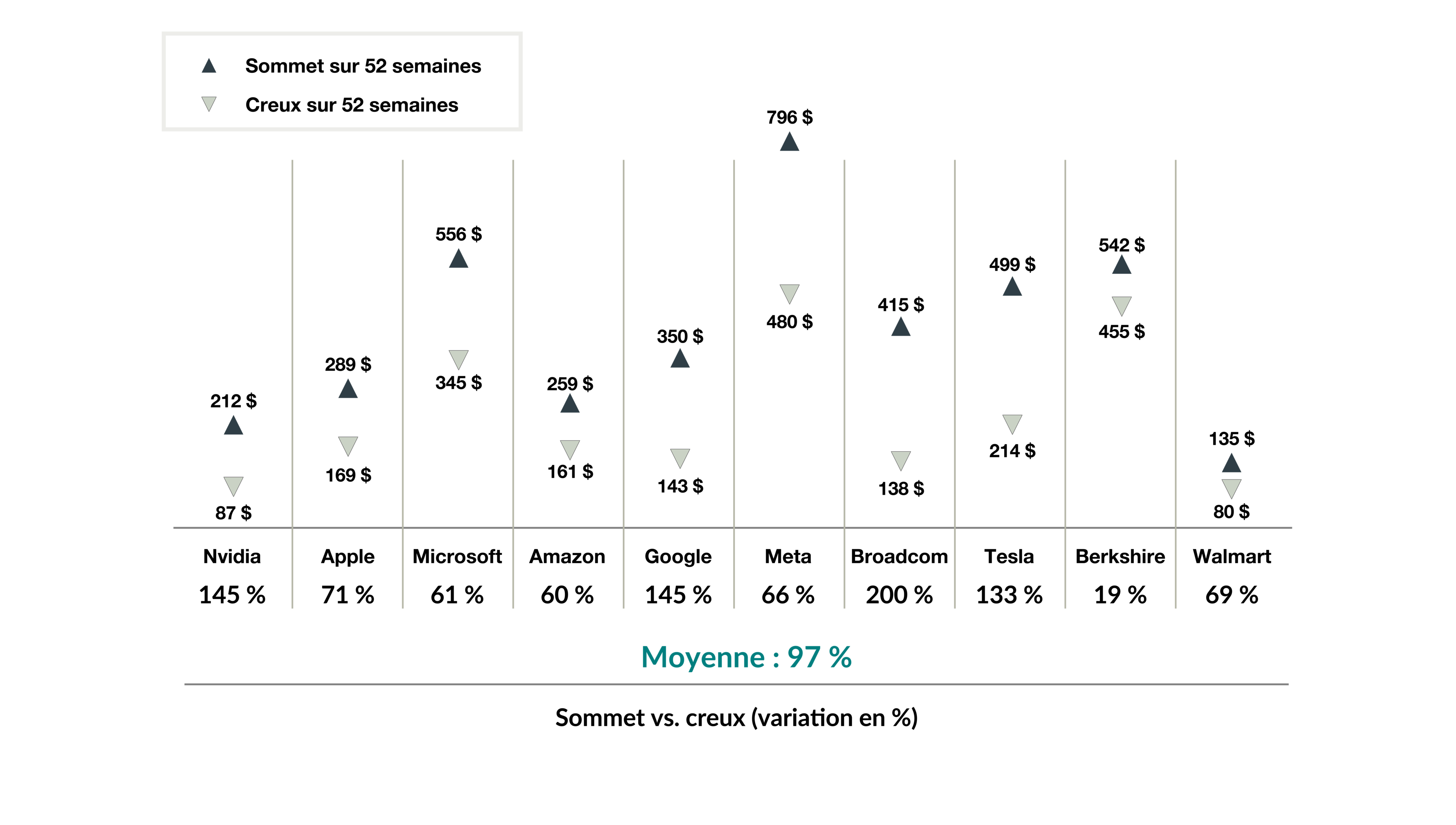 On constate que les mêmes mécanismes de peur et d’avidité influencent les cours des actions des entreprises. Neuf des dix plus grandes entreprises américaines affichent une capitalisation boursière supérieure à 1 000 milliards $US. Ce sont les entreprises les plus suivies au monde, et pourtant, chaque année, on observe un écart considérable entre leur plus haut et leur plus bas sur 52 semaines.
