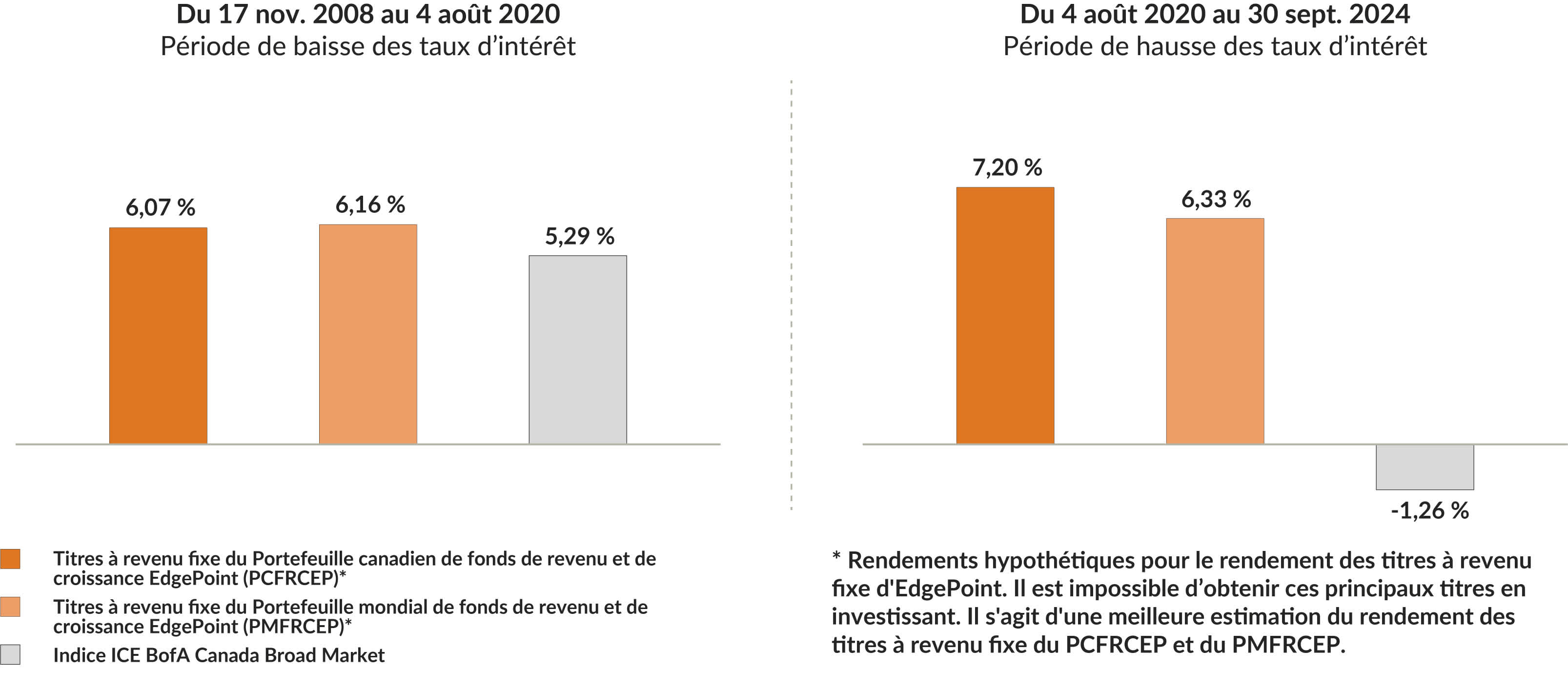 Source, EdgePoint : FactSet Research Systems Inc. Source, indice : Bloomberg LP. Au 30 septembre 2024. Le mois d'août 2020 a été choisi parce qu'il comprend la date du rendement le plus bas de l'obligation d'État américaine à 10 ans et qu'il marque le début d'un environnement de hausse des taux d'intérêt. Les rendements des titres à revenu fixe du EPGIP et du EPCIP sont exprimés en monnaie locale, nets de frais, et sont des approximations calculées sur la base des données relatives aux actifs en fin de journée (les cours réels ne sont pas pris en compte). La série F est offerte aux investisseurs dans le cadre d'une entente de frais de service et de conseil et n'exige pas qu'EdgePoint engage des frais de distribution sous forme de commissions de suivi aux courtiers. Référez-vous aux sections Informations importantes - Indices et points de référence et Informations importantes - Rendements et frais des titres à revenu fixe du Portefeuille EdgePoint pour plus de détails.