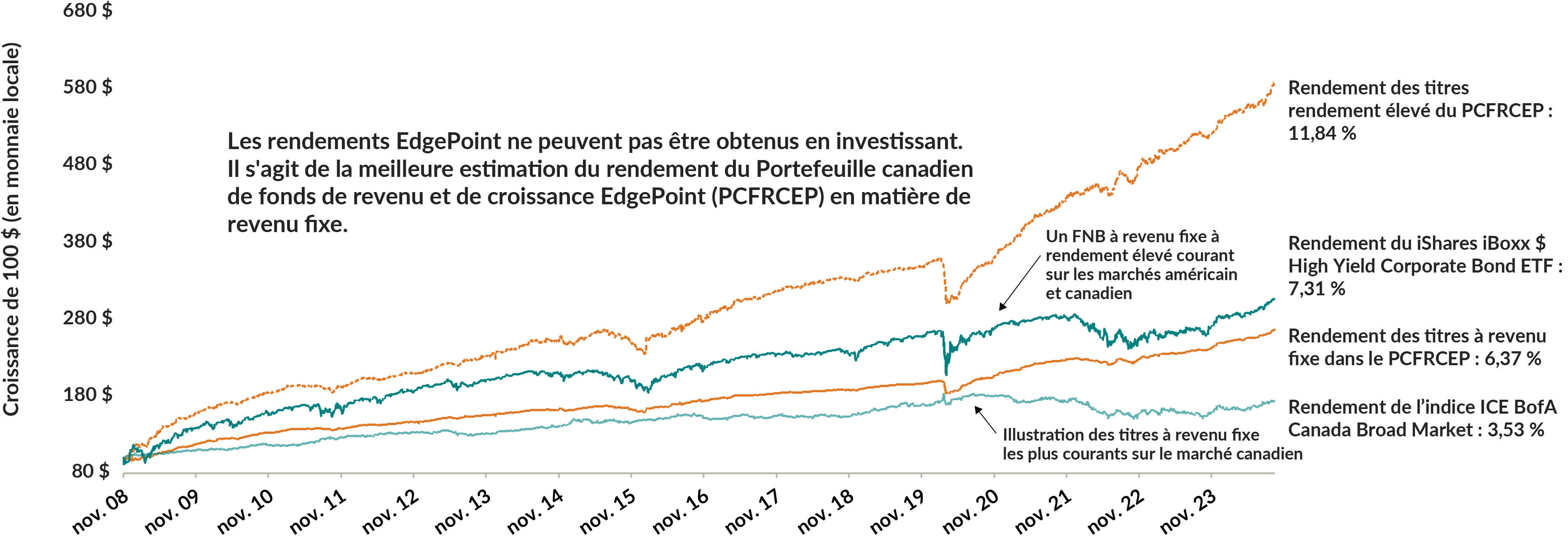 Portefeuille canadien de fonds de revenu et de croissance EdgePoint, série F – ÀCJ : 1,99 %, 1 an : 15,05 %, 3 ans : 12,36 %, 5 ans : 13,91 %, 10 ans : 9,18 %, 15ans : 9,57 %, Depuis le lancement (17 nov. 2008) : 11,63 %. iShares iBoxx $ High Yield Corporate Bond ETF - ÀCJ : 2,34 %; 1 an : 10,04 %; 3 ans : 4,37 %; 5 ans : 3,89 %; 10 ans : 3,96 %; 15 ans : 5,34 %; Depuis le lancement (17 nov. 2008) : 7,26 %. Indice ICE BofA Canada Broad Market – ÀCJ : 2,28 %, 1 an : 8,37 %, 3 ans : 1,44 %, 5 ans : 0,36 %, 10 ans : 1,71 %, 15 ans : 3,14 %, Depuis le lancement (17 nov. 2008) : 3,58 %.