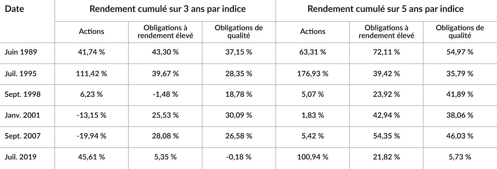 Source : Bloomberg LP. Rendement total en $US. Au 30 septembre 2024. Les indices sont l'indice S&P 500 (actions), l'indice ICE BofA US High Yield (obligations à rendement élevé) et l'indice ICE BofA US Corporate (obligations de qualité). Il est impossible d’investir dans les indices. Les dates retenues sont les premières fins de mois suivant la première baisse des taux d'intérêt par la Réserve fédérale américaine. Référez-vous à la section Informations importantes - Indices et références pour plus de détails.