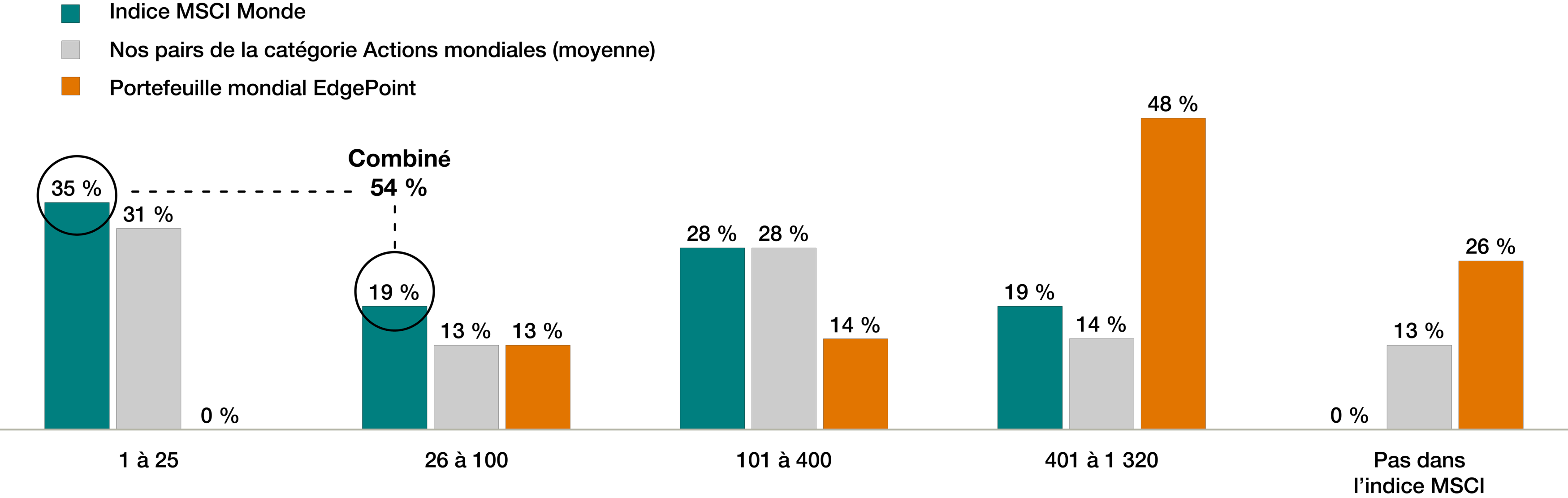 Portefeuille mondial EdgePoint par rapport à ses pairs de la catégorie Actions mondiales – pondération du portefeuille des titres composant l’indice MSCI Monde