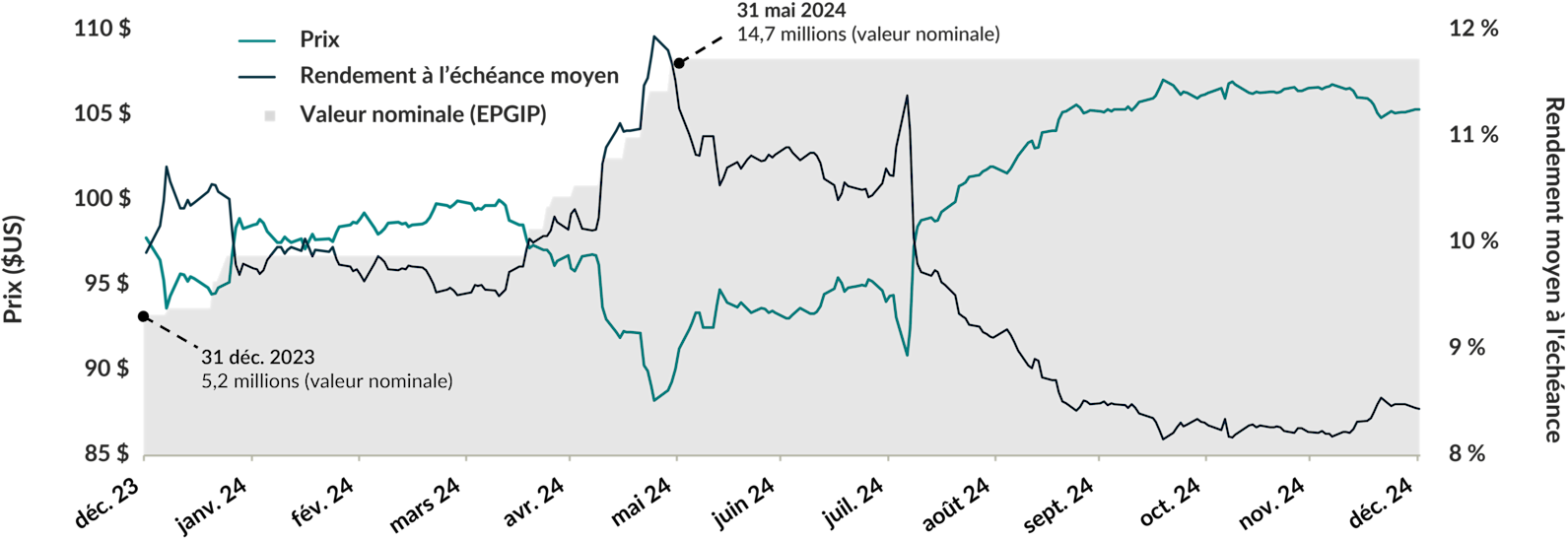 Source : Bloomberg LP. Le rendement moyen à l'échéance est le rendement à l'échéance d'une obligation basé sur le point médian entre le prix demandé le plus bas (vente) et le prix offert le plus élevé (achat) disponibles sur les marchés publics. Le rendement à l'échéance est le rendement total attendu d'une obligation si elle est conservée jusqu'à son échéance et que les paiements de coupon sont réinvestis au rendement à l'échéance. Le rendement à l'échéance est exprimé en taux de rendement annuel. Au 31 décembre 2024, les titres de Forward Air Corp. étaient détenus dans le Portefeuille mondial de fonds de revenu et de croissance EdgePoint, le Portefeuille canadien de fonds de revenu et de croissance EdgePoint et le Portefeuille de revenu mensuel EdgePoint. Les renseignements sur les titres des sociétés susmentionnées ne constituent pas des conseils en matière d'investissement. Ils ne sont pas représentatifs de l'ensemble du portefeuille et ne constituent pas une garantie de rendement futur. Le Groupe de placements EdgePoint inc. peut acheter ou vendre des positions dans les titres susmentionnés. Les rendements passés ne garantissent pas les résultats futurs.