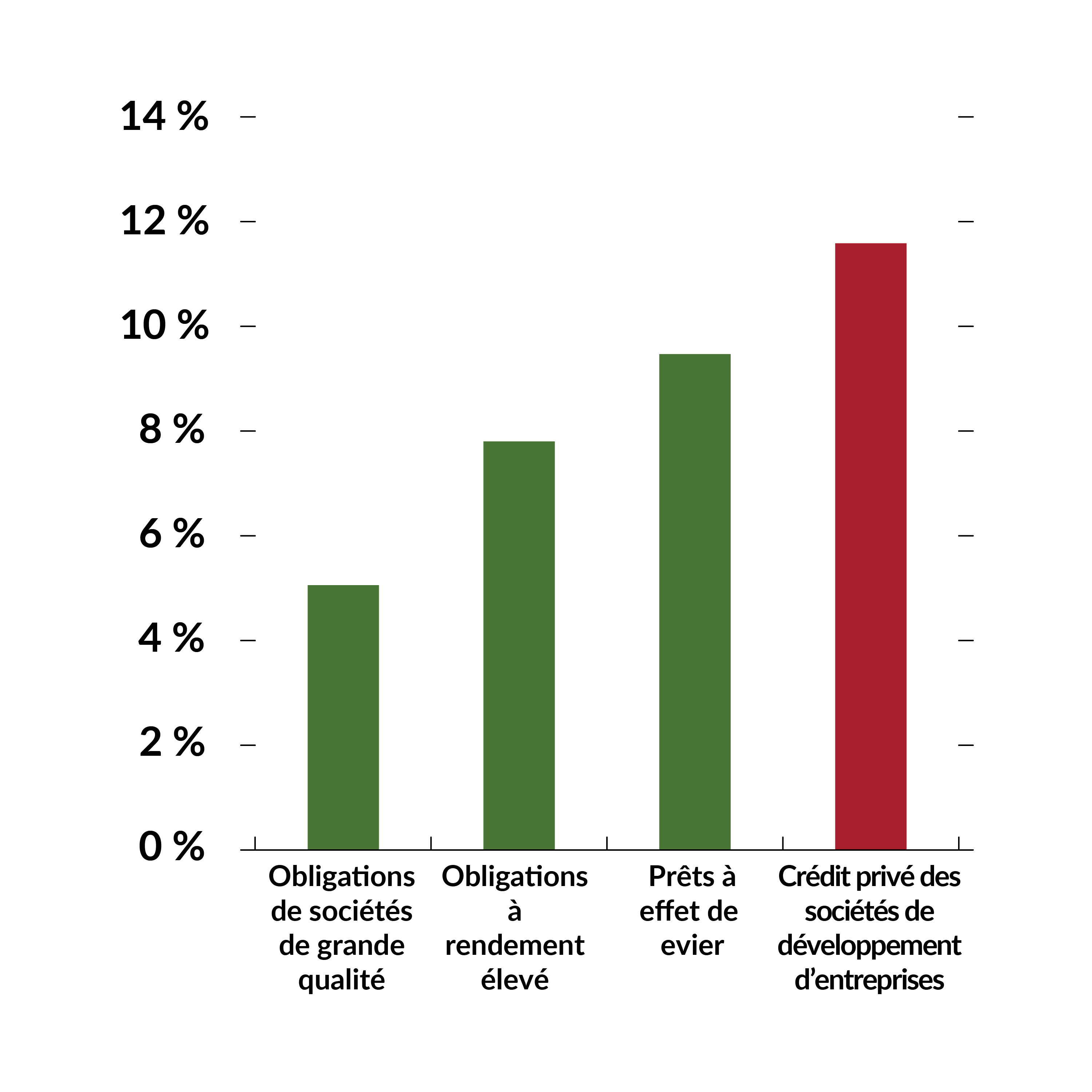 Le total des dépenses annuelles en 2023 du portefeuille moyen de crédit privé s'élevant à plus de 4 % de l'actif net, le fonds de crédit privé moyen doit prêter à un taux au minimum plus élevé que cela comparativement à celui du marché des titres à rendement élevé, simplement pour avoir une chance de suivre le rythme. C'est donc ce qu'ils font. Le rendement moyen d'un portefeuille de crédit privé est aujourd'hui de 12 % comparativment à 8 % pour l'obligation à rendement élevé moyenneiv.