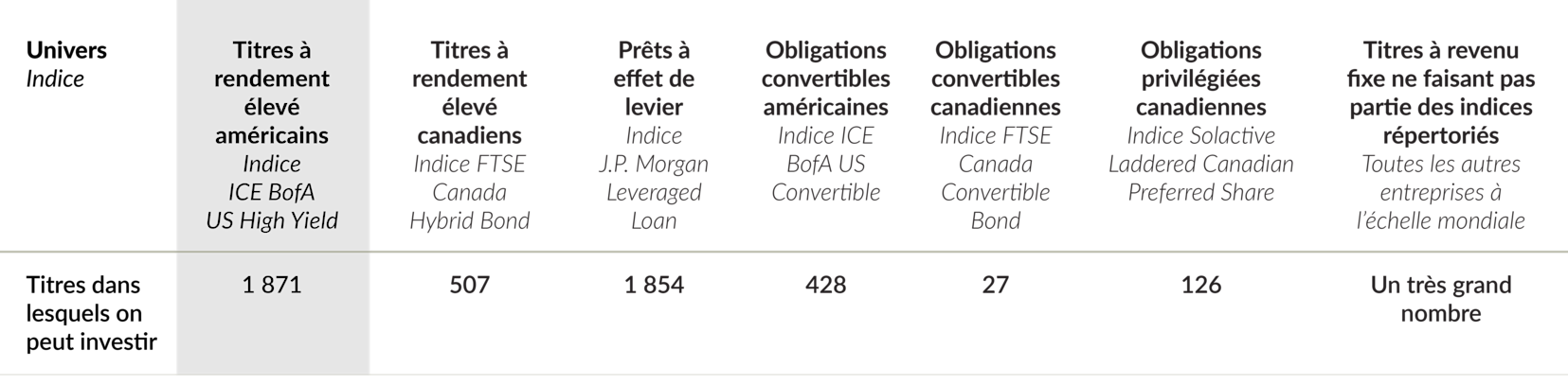 L'univers existant d'obligations américaines et canadiennes à rendement élevé, de prêts et de dettes convertibles comprend plus de 4 400 investissements parmi lesquels nous pouvons choisir.